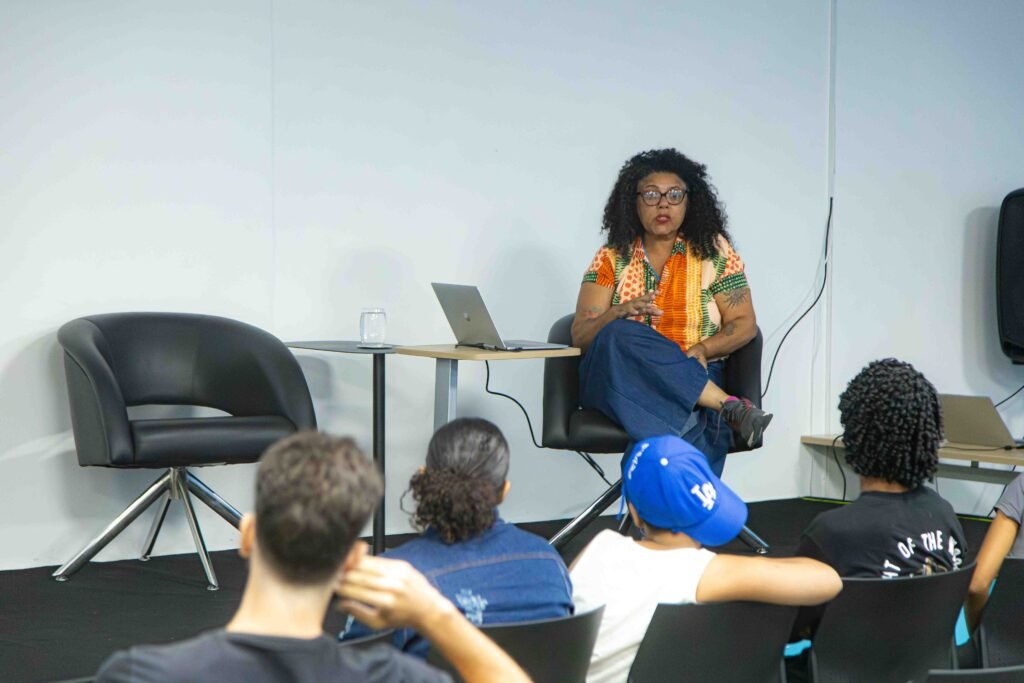 A cineasta Natara Ney na masterclass Edição e Montagem para o Cinema que aconteceu no Hub ES+ dentro do Trilhas da Cultura. Foto: Melina Furlan/ Acervo Galpão IBCA