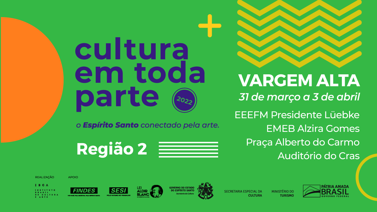 A caravana do Cultura em Toda Parte 2022 – Região 2 pega a estrada novamente! Depois de passar pelo município de Baixo Guandu, agora é a vez da cidade de Vargem Alta ser a cidade sede do evento.  De 31 de março a 03 de abril, o público vai conferir 14 apresentações e seis atividades de formação jogando luz sobre a pluralidade da produção cultural do Espírito Santo.