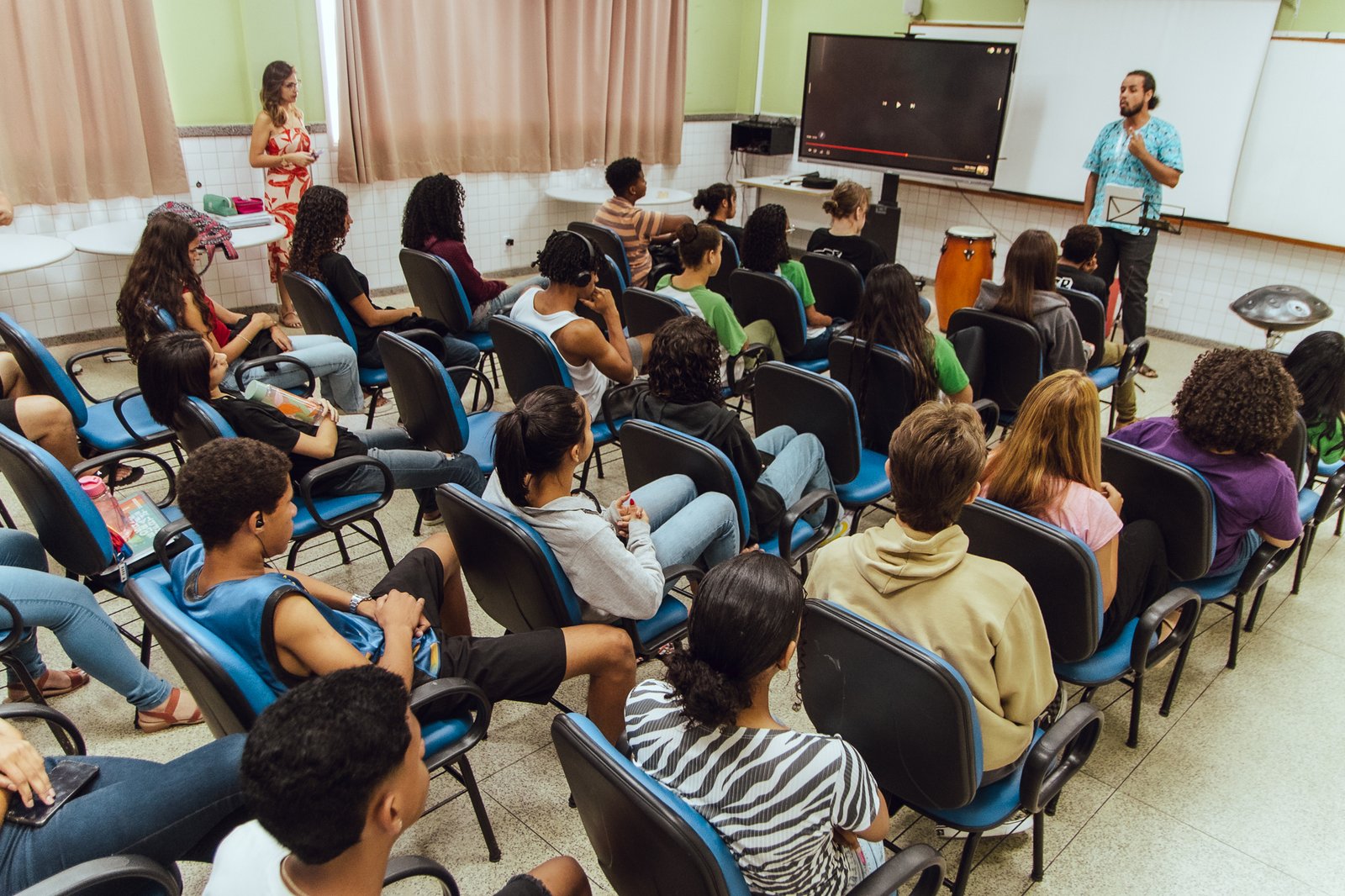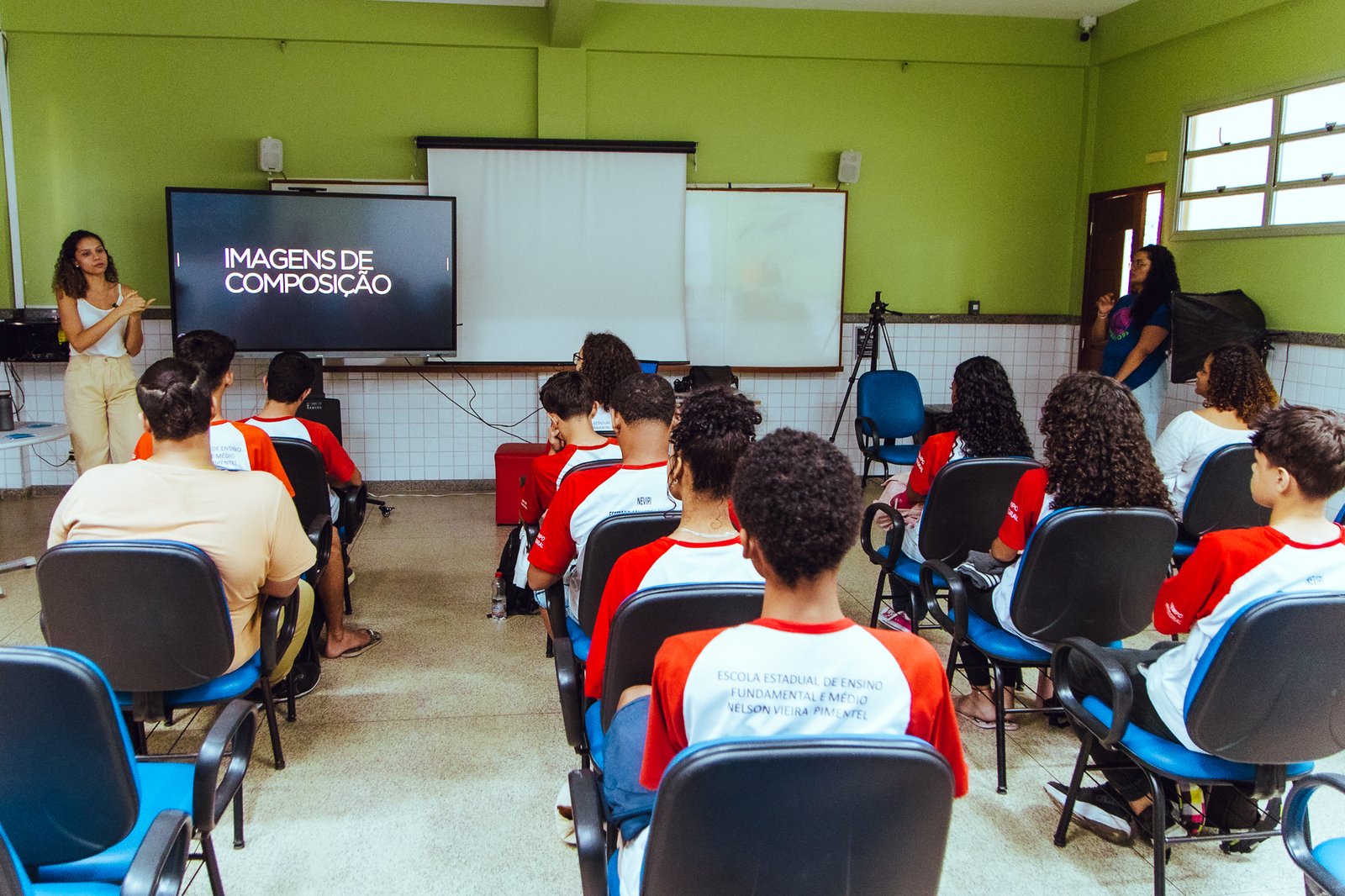 Os estudantes da Escola Estadual de Ensino Fundamental e Médio (EEEFM) Nelson Vieira Pimentel participaram, na última sexta-feira (13), de duas formações bem diferentes das matérias que eles estudam tradicionalmente no dia a dia. Pela manhã, o músico e professor Léo de Paula mediou a palestra “Toques Bantos e Influências na Musicalidade Brasileira”. Já à tarde, a diretora e roteirista Pâmelly Goes ministrou a oficina “Gravação e Edição de Vídeos pelo Celular”.