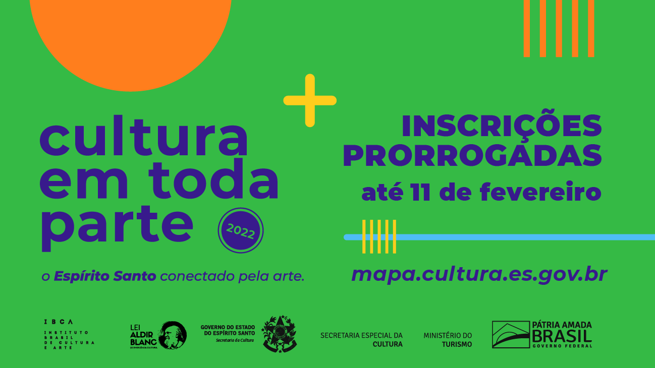 As inscrições para o Cultura em Toda Parte 2022 foram prorrogadas. Artistas e produtores culturais terão até o dia 11 de fevereiro para se inscrever na chamada pública que irá selecionar apresentações artísticas para compor a programação do projeto, que acontece entre os meses de março e maio, em 10 municípios do estado. O edital já está disponível aqui.