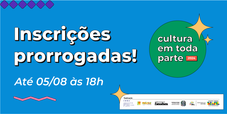 Foi prorrogada a inscrição de seleção para interessados em participar das apresentações culturais, oficinas e palestras da programação do “Cultura em Toda Parte 2024” para até a próxima segunda-feira (05). Serão realizados eventos culturais com ações de formação, difusão e circulação cultural em 24 localidades do Espírito Santo.