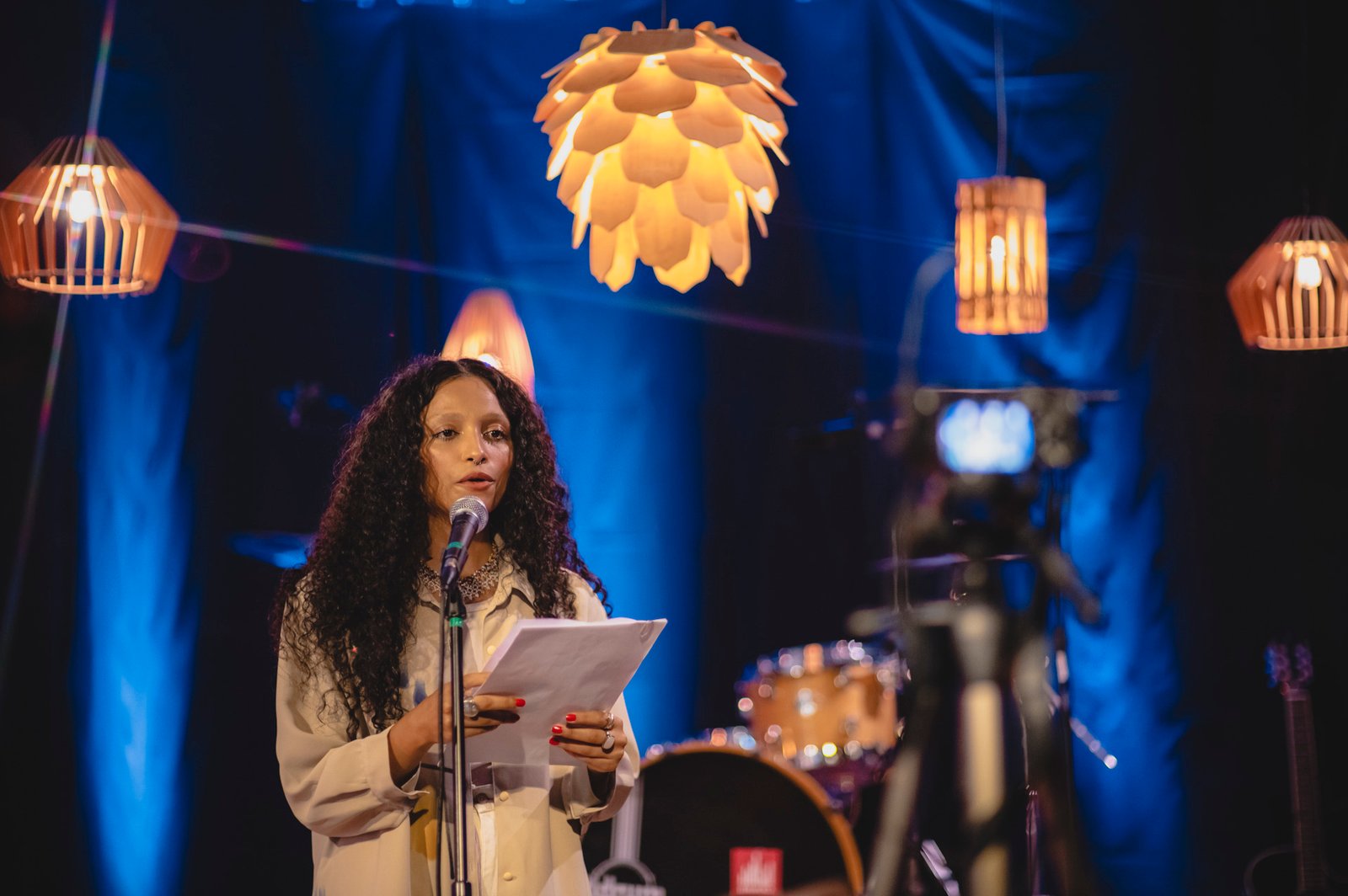 Larissa Delbone, produtora executiva da Galpão Produções, deu as boas-vindas ao público. Foto: Levi Mori/ Divulgação