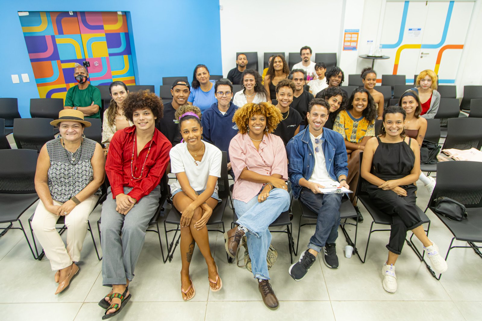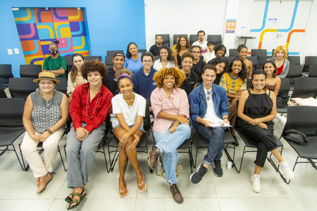 Safira Moreira (centro) e a turma que esteve presente na masterclass Direção em Fotografia, no Hub ES+. Foto: Melina Furlan/ Acervo Galpão IBCA